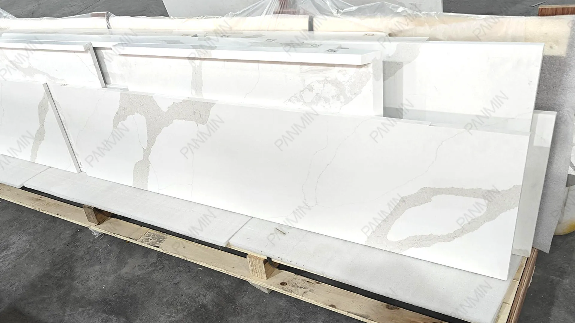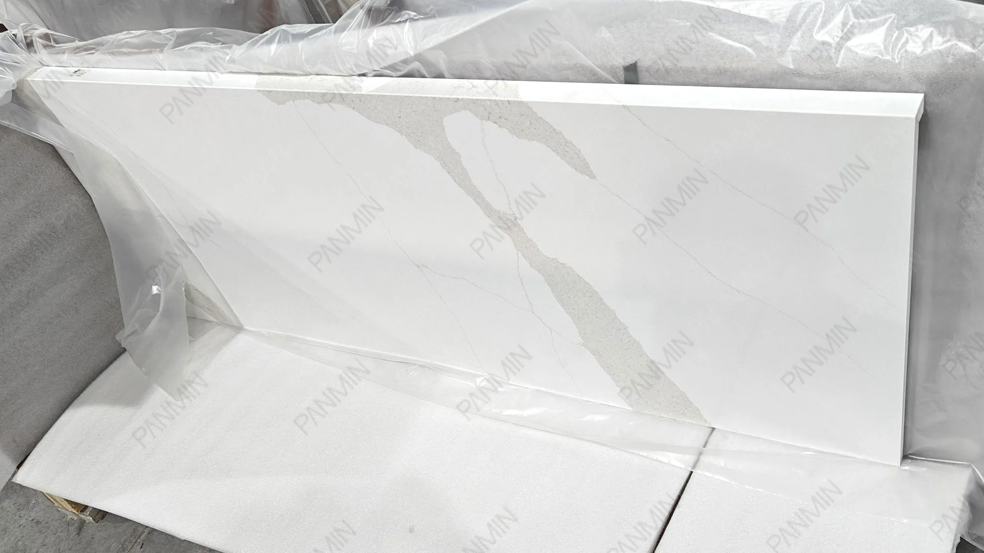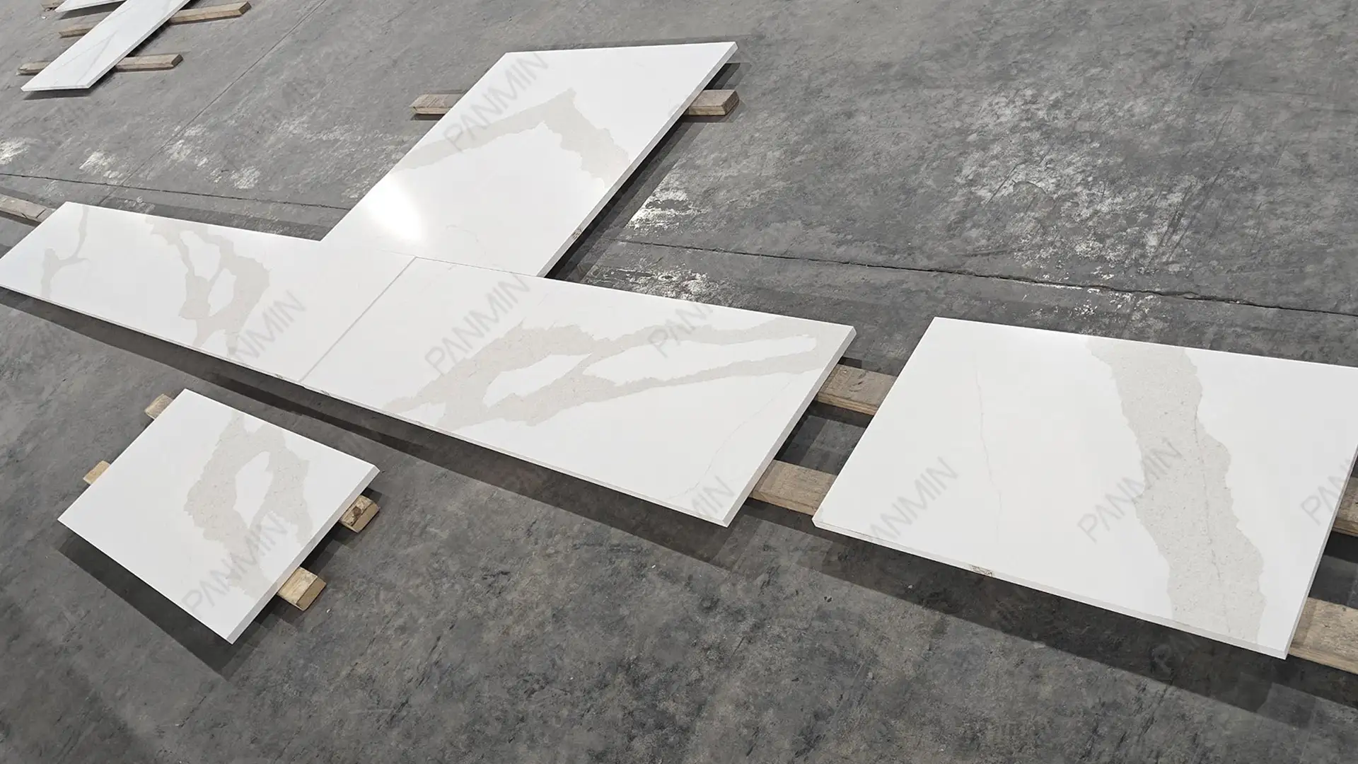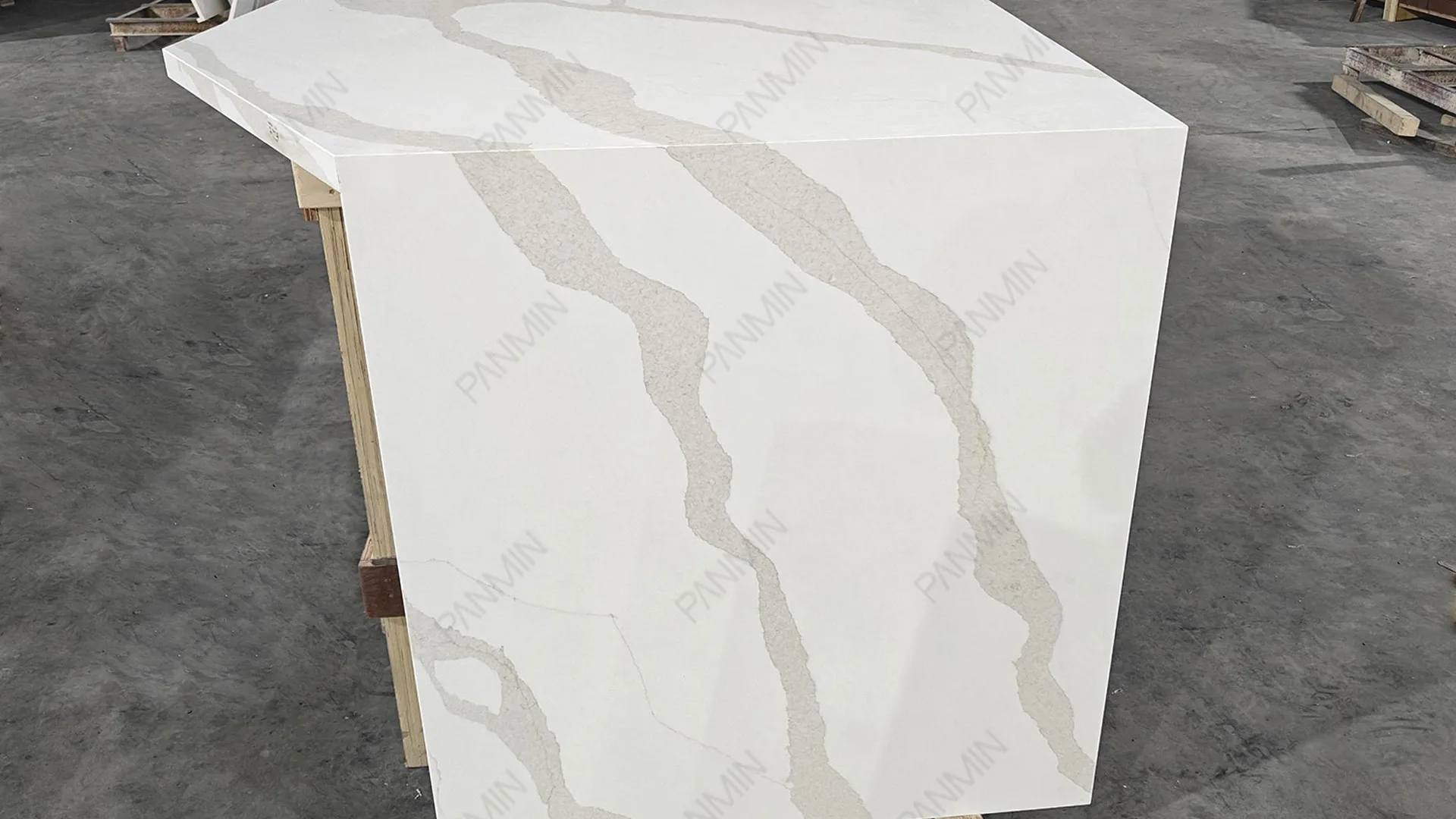 优质材料仅仅是起点。真正让住宅项目从“建造良好”升华为“建筑精益”的关键,在于对石材大板的解读与运用。在本项目中,鱼肚金石英石 PMC2798GJ 并非被视为简单的装饰表面,而是被视为一种结构化的设计语言。在我们的石英石工厂,每一块大板在切割前都经过严格审核。通过分析纹理走向、律动强度和过渡区域,确保最终安装效果呈现为统一的构图,而非零散组件的堆砌。