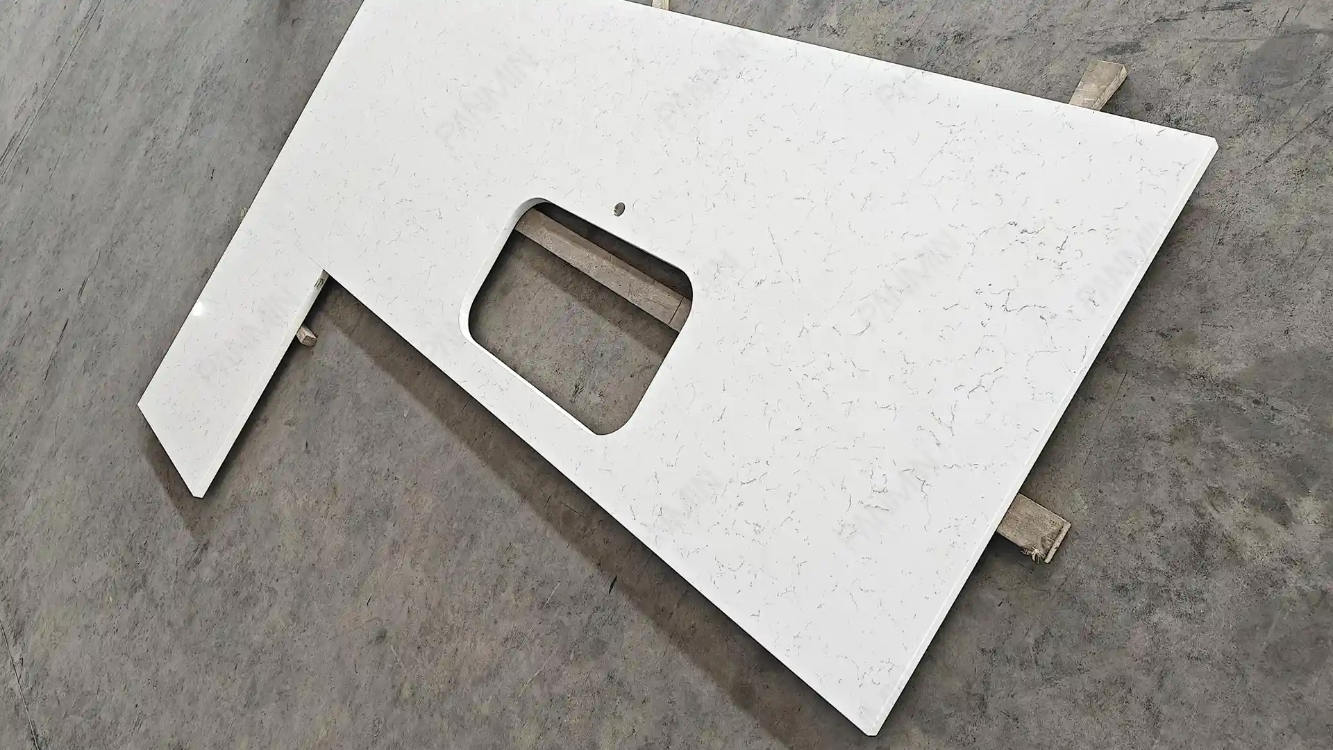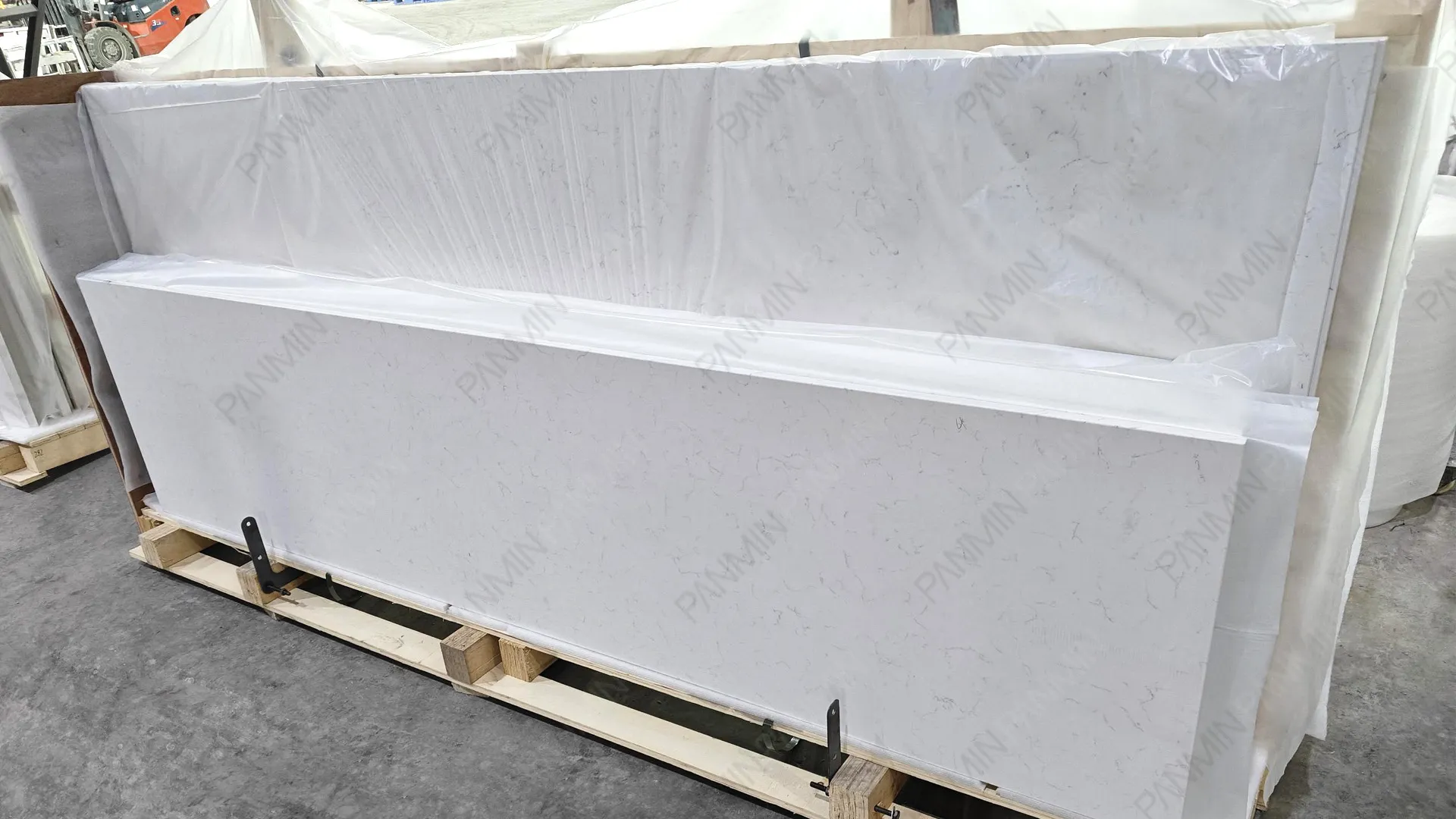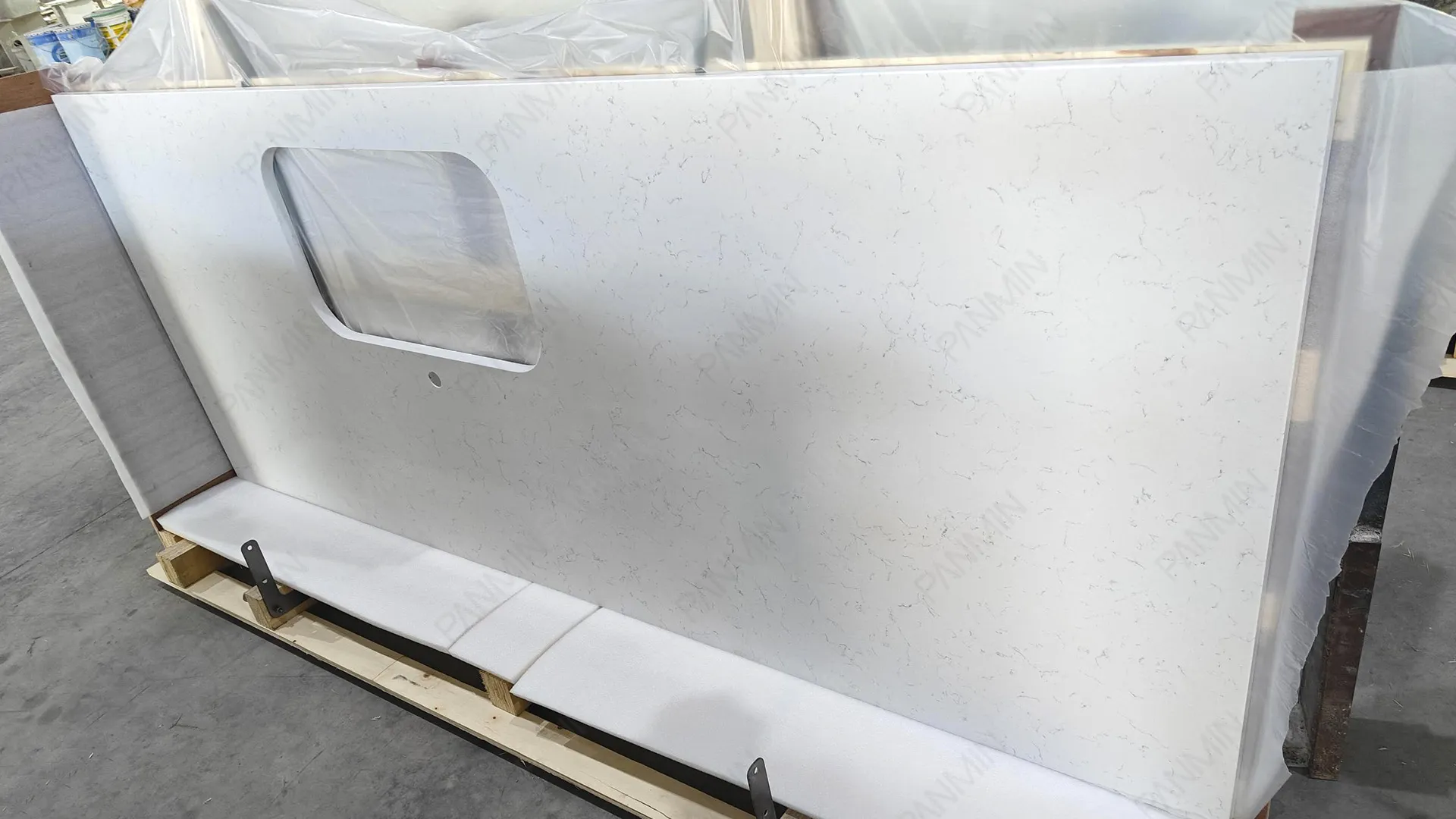 在美国住宅市场,石英石台面凭借高端的视觉吸引力和无忧的维护体验,已成为行业标准。该产品以其明亮的白色基底和精致的浅灰色纹理,打造出永恒、内敛且极具通用性的现代室内空间。它旨在承受厨房和卫浴的高频使用,为开发商和物业管理团队提供了长期资产价值的可靠基础。