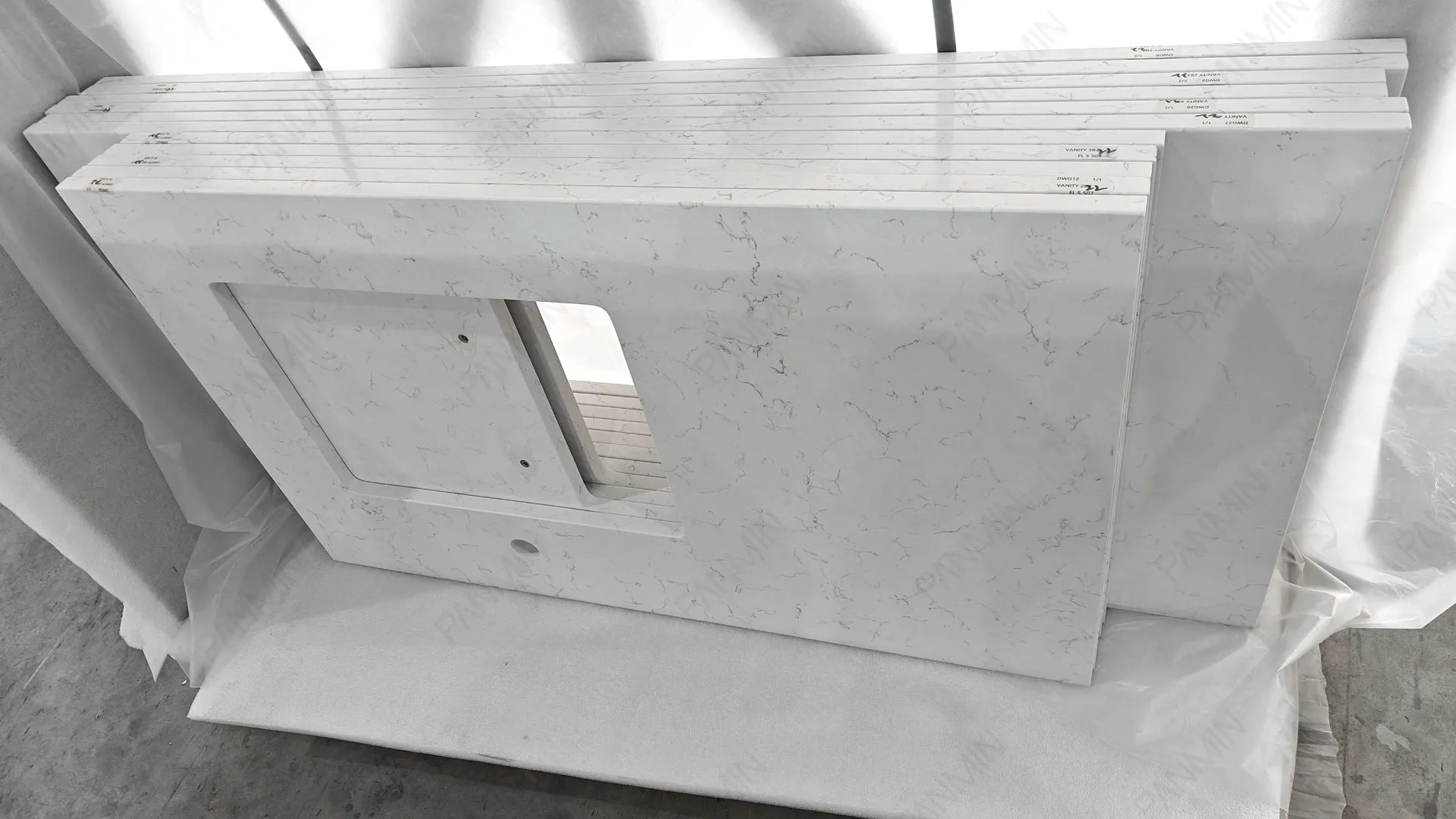 在近期的一项美国公寓项目中,由柬埔寨高金石工厂生产的卡拉拉白石英石被选用为该项目的用材,应用于多个住宅单元的板材配置。该项目通过追求从开放式厨房到紧凑型卫浴等不同空间中板材的外观一致性与结构完整性,体现了在大规模交付中保持一致性的价值。
