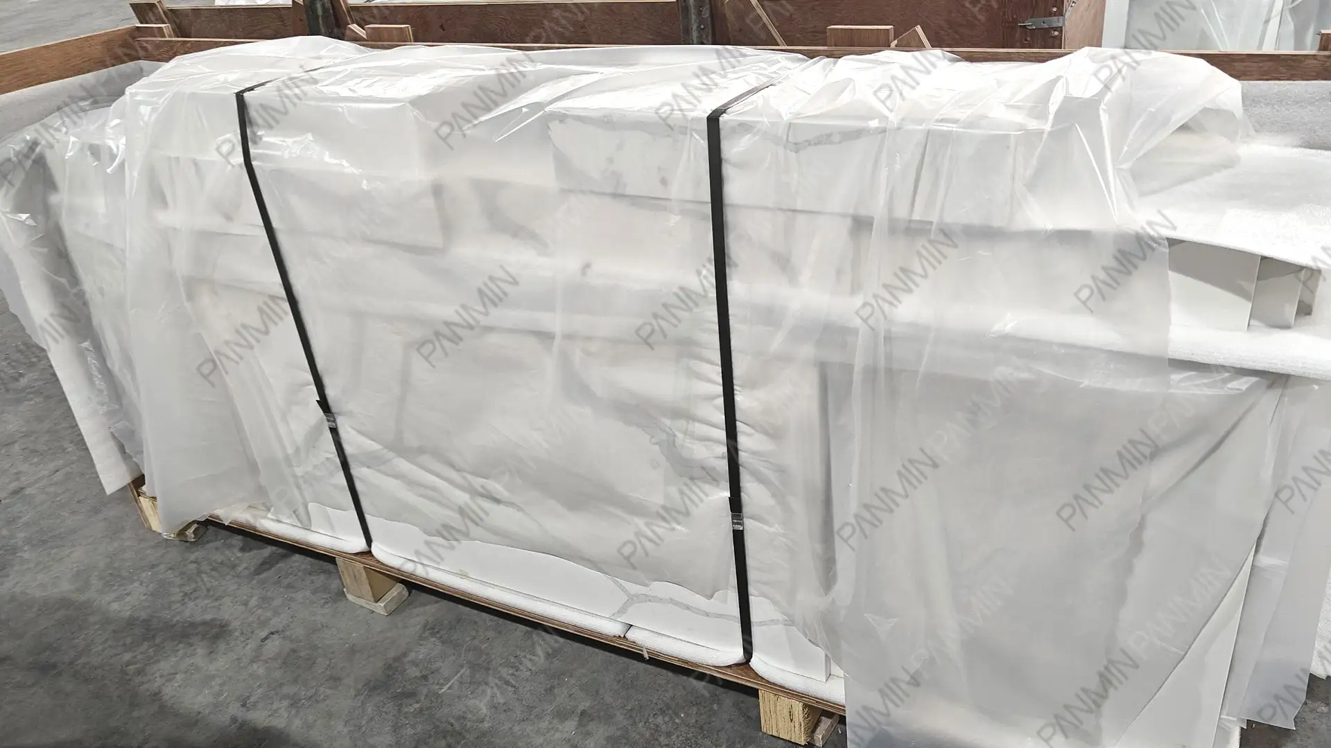 该项目由柬埔寨高金石工厂严格按照项目图纸与标准精确加工,对板材PMC1017GJ 进行了专业的切割、CNC 精密加工与细致的表面与边部处理。通过精准的“对纹”工艺实现了更具统一性的视觉外观,水槽位与龙头孔位等开孔也以高精度工艺完成。这种对细节的极致追求,确保了现场安装的顺畅以及更完美的最终呈现——在每一处细节都关乎住客体验的酒店行业,这一点至关重要。