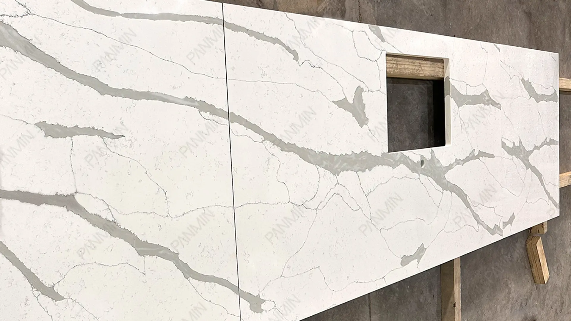 现代商业空间高度依赖线性 LED 灯带来定义建筑轮廓。PMC1930GJ 的磨光面在隐藏式灯带的照射下,能产生细微的光线折射与柔和的漫反射,为静态的台面增添了层次感与空间深度,且不会喧宾夺主。