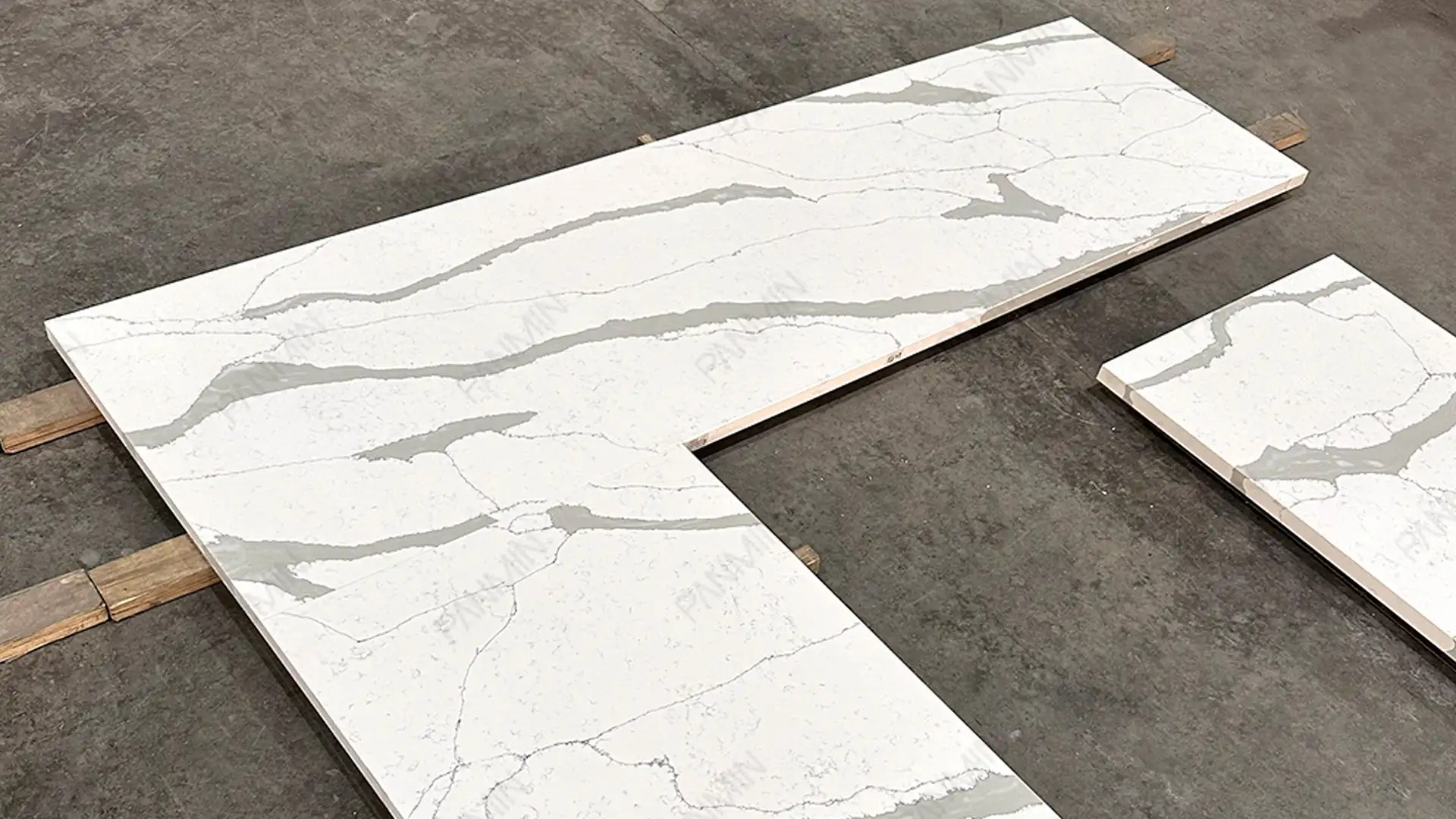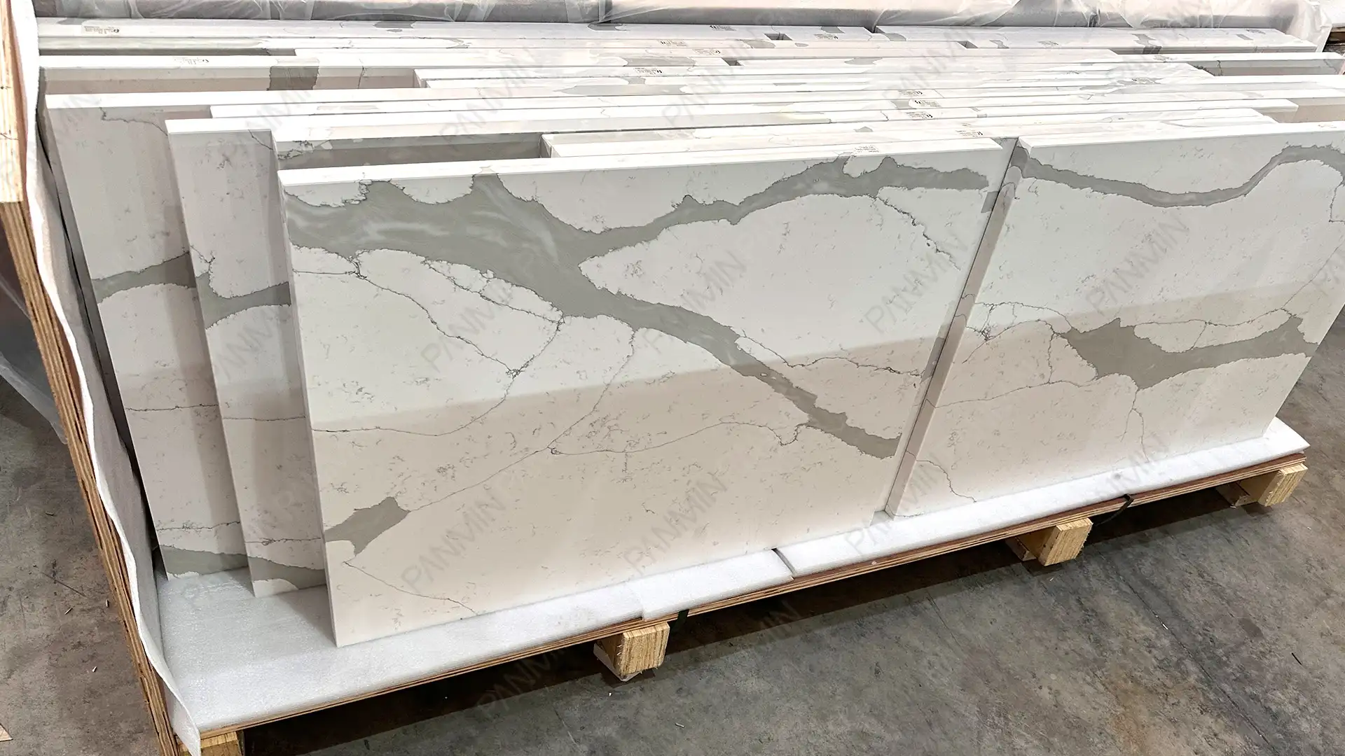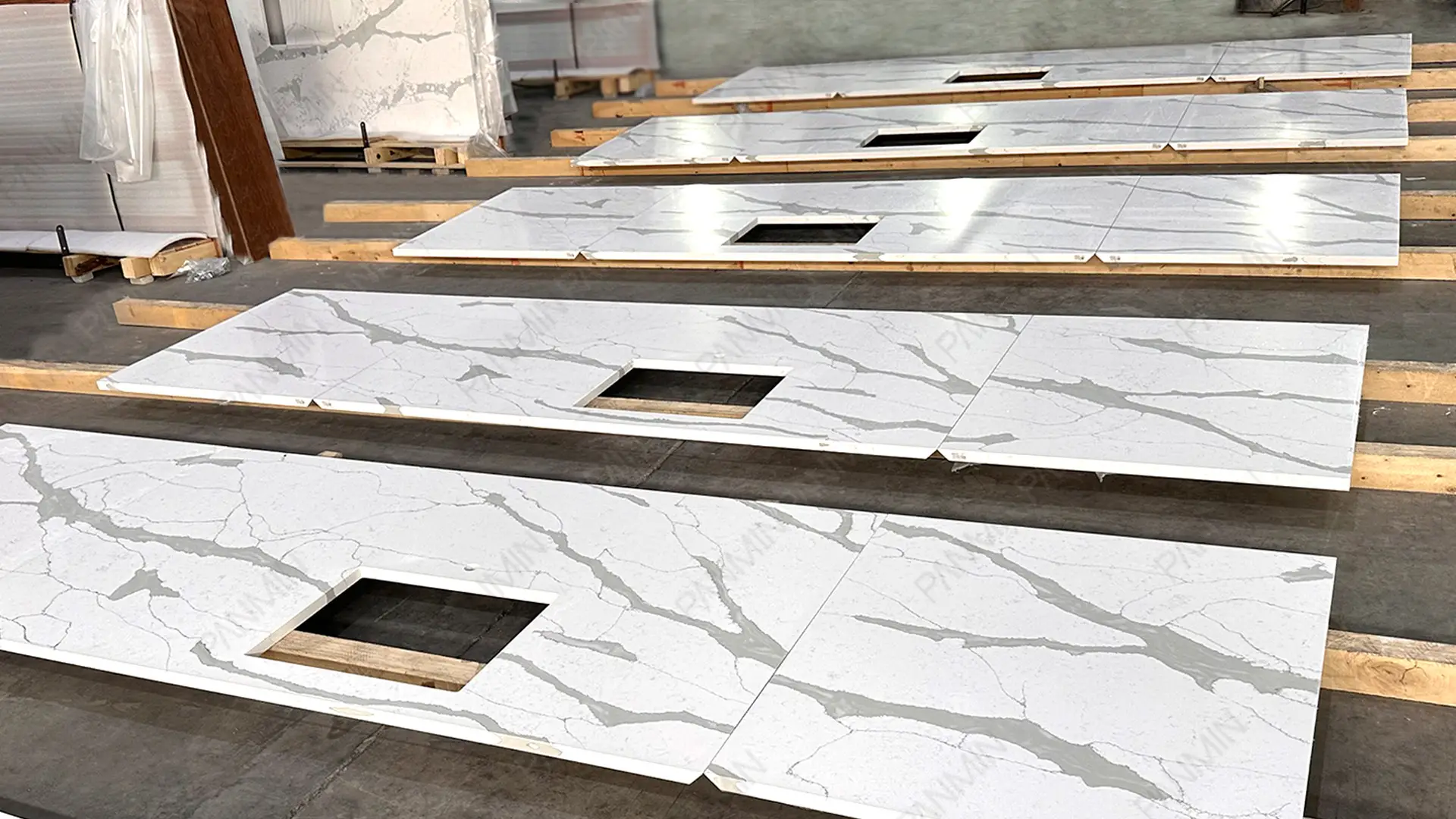 在该项目中,PMC1930GJ 通过稳定的配方体系与标准化生产流程,呈现出纯白底色与炭灰纹理之间更为均衡的视觉关系。在大规模商业施工中,天然石材的色差常导致材料超额订购、现场退板和工期延误;相比之下,受控的鱼肚白石英石生产工艺确保了从样板房到每个标准单元的高度统一。这种一致性不仅关乎颜值,更确保了安装进度的可控性,有效降低了项目的交付风险。