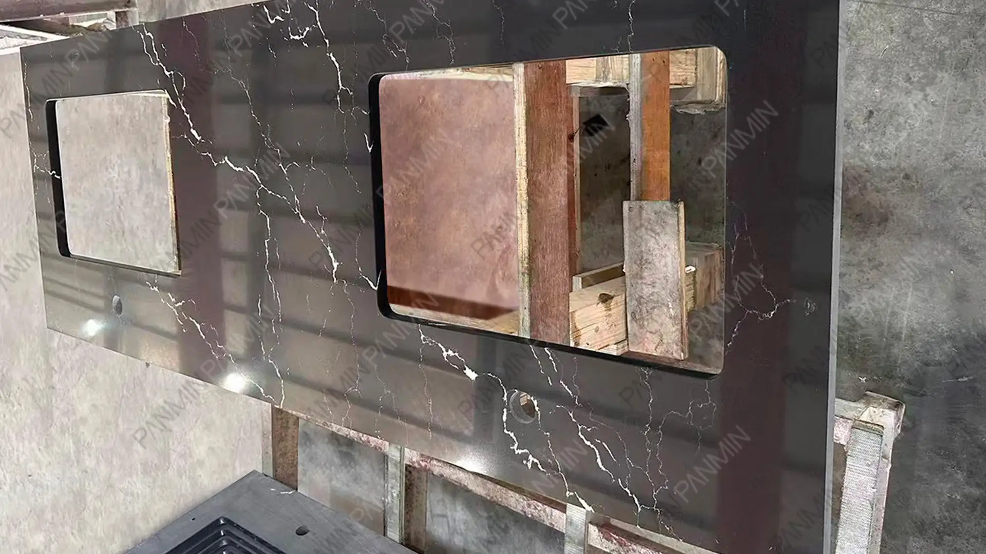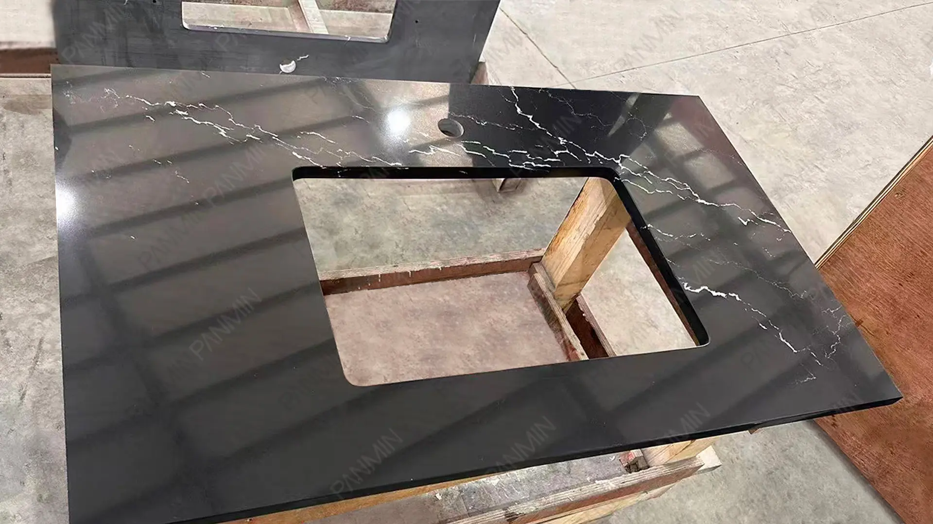 在本项目中,PMC2125GJ 黑色石英石台面通过深黑色与白色纹理的并置,提供了一种内敛而独特的视觉秩序。此外,标台加工方式为材料的切割、钻孔和封边提供了标准化的解决方案。标台加工有助于建筑中多个空间的安装一致性,同时大幅减少了安装过程中的变量。这使得石材纹理在最终交付的项目中得到了更精准的呈现。
