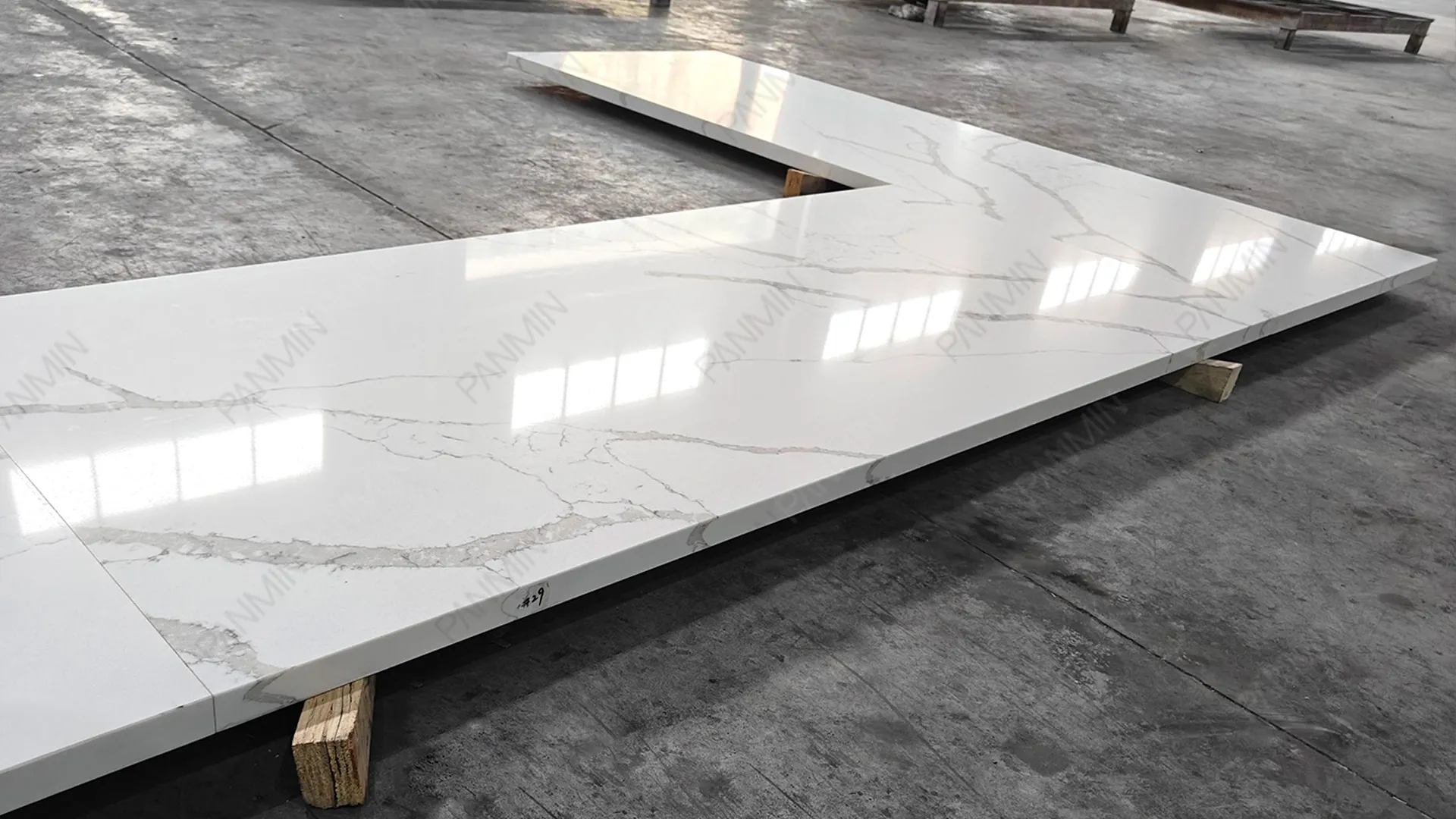 在商业台面安装中,拼缝规划是核心环节之一。当台面尺寸超过单块板材规格时,需要通过可控的直线拼缝实现结构连接。在本项目中,L 型转角与延伸区域采用了直线拼缝处理。边缘以 90 度精准切割,形成干净且可控的拼接线条。这种方式在保证结构稳定与加工效率的同时,也维持了视觉连续性,符合酒店与多户型开发项目的标准化施工要求。在排版规划阶段,纹理方向亦进行了对应协调。在大型商业安装中,采用直线拼缝等策略,有助于优化施工顺序、结构加固及整体交付流程,同时确保结构可靠与视觉统一。